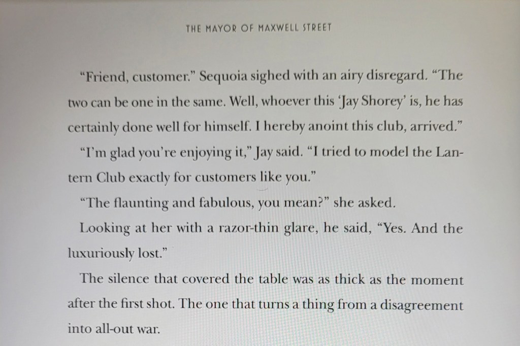 In this story, the glitz and glamor of the roaring 20’s is mingled with the underbelly of Prohibition-era Chi-town. Speakeasy passwords, illegal champagne, gangstas, mafiosos, shady politicians, and the mystery surrounding this Mayor of Maxwell Street, who people paint as a boogeyman, make for an entertaining read. Side note: he didnt seem like such a bad guy to me. No worse than the other hoodlums. He just wanted them to stop fighting over turf and focus on getting bread together.